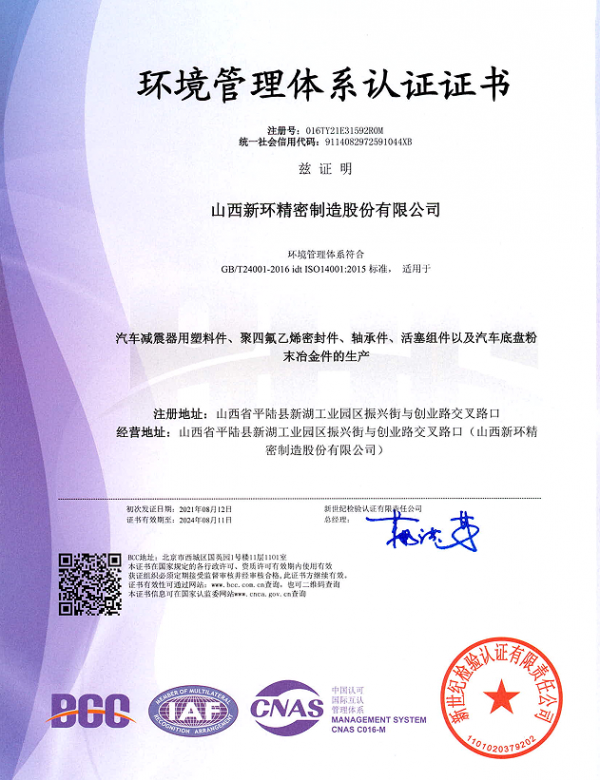 山西新環精密制造股份有限公司創建于1992年,是以研發、生產、銷售粉末冶金類、工程塑料類、橡膠制品類、氟塑類產品為主的高新技術企業。位于交通發達的山西省平陸縣城,距離三門峽市6 km,毗鄰隴海線,高鐵直達北京、上海、成都均為5小時左右,到達鄭州、西安皆為1小時,距離運城市機場35km。旗下子公司有:山西新環粉末冶金有限公司、山西新環科技有限公司、寧波新環氟塑料制品有限公司、寧波新環氟塑料制品有限公司軸業分公司、新勝達氟塑制品有限公司。現有高、精、尖設備120余臺套,固定資產總額1.8億元,年銷售額2.6億元。